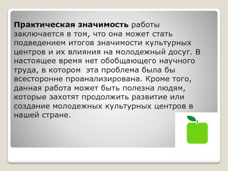 Практическая значимость работы заключается в том, что она может стать подведением итогов значимости культурных центров и их