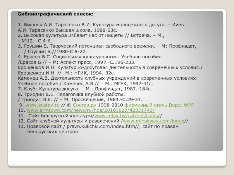 Библиографический список: 1. Вишняк А.И. Тарасенко В.И. Культура молодежного досуга. – Киев:А.И. Тарасенко Высшая школа, 1988-53с.2. Высокая культура