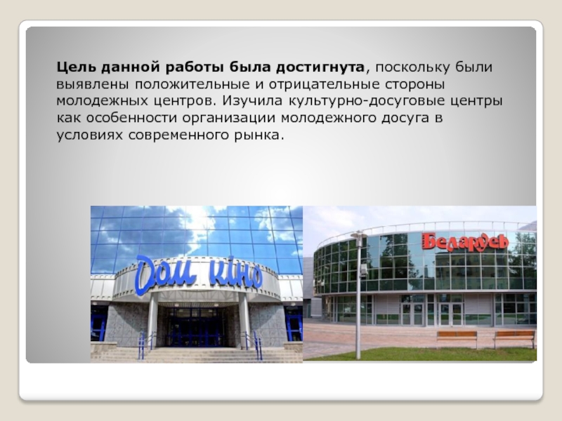 Цель данной работы была достигнута, поскольку были выявлены положительные и отрицательные стороны молодежных центров. Изучила культурно-досуговые центры