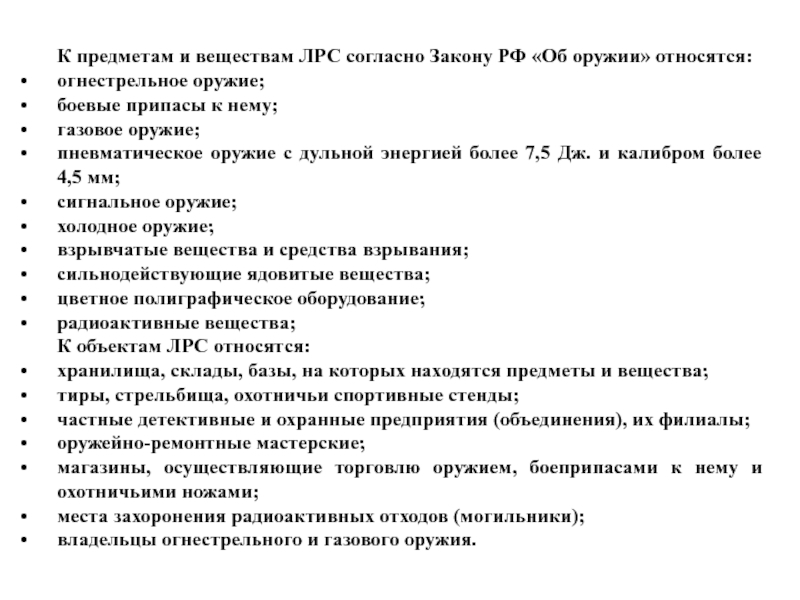 Слайд 5К предметам и веществам ЛРС согласно Закону РФ «Об оружии»
