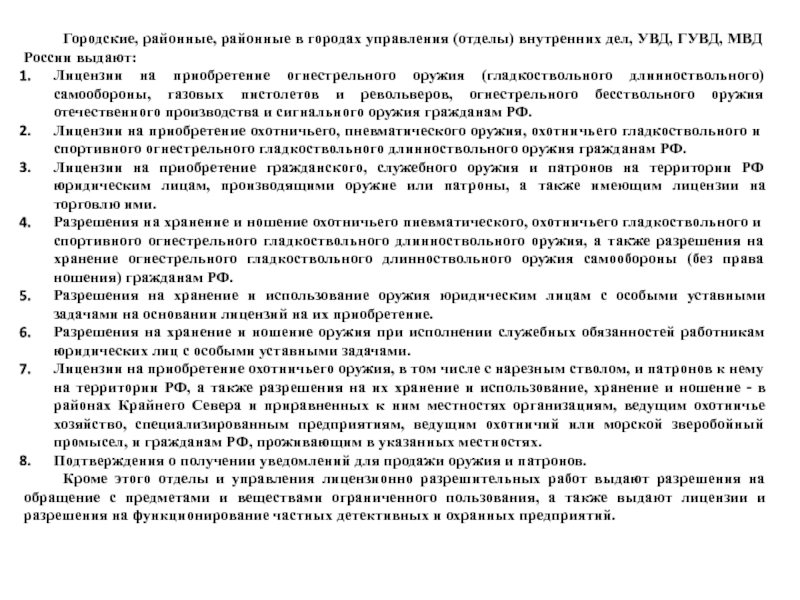 Кроме этого отделы и управления лицензионно разрешительных работ выдают разрешения на обращение с предметами и веществами ограниченного пользования, а также выдают лицензии и разрешения на функционирование частных детективных и охранных предприятий.