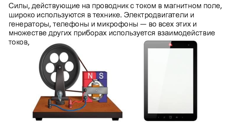 Слайд 11Силы, действующие на проводник с током в магнитном поле, широко