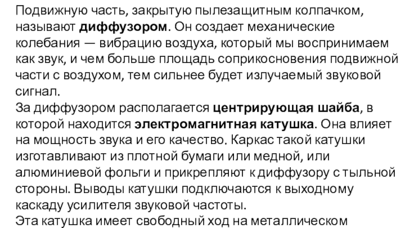 Слайд 22Подвижную часть, закрытую пылезащитным колпачком, называют диффузором. Он создает механические колебания