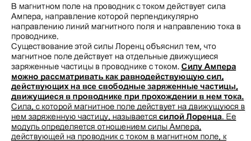 Существование этой силы Лоренц объяснил тем, что магнитное поле действует на отдельные движущиеся заряженные частицы в проводнике с током. Силу Ампера можно рассматривать как равнодействующую сил, действующих на все свободные заряженные частицы, движущиеся в проводнике при прохождении в нем тока.