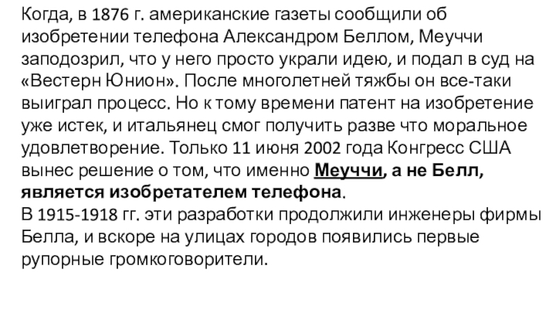 и подал в суд на «Вестерн Юнион». После многолетней тяжбы он все-таки выиграл процесс. Но к тому времени патент на изобретение уже истек, и итальянец смог получить разве что моральное удовлетворение. Только 11 июня 2002 года Конгресс США вынес решение о том, что именно Меуччи, а не Белл, является изобретателем телефона.