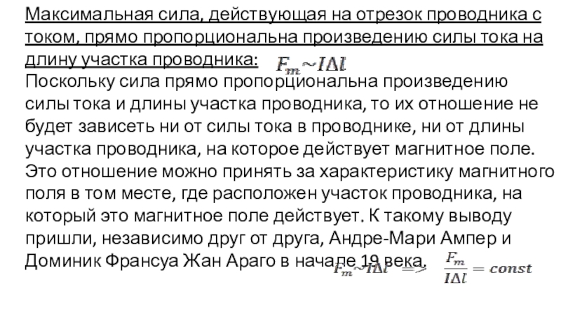 Слайд 7Максимальная сила, действующая на отрезок проводника с током, прямо пропорциональна
