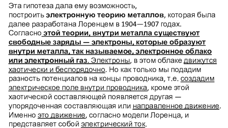 свободные заряды — электроны, которые образуют внутри металла, так называемое, электронное облако или электронный газ. Электроны, в этом облаке движутся хаотически и беспорядочно. Но как только мы подадим разность потенциалов на концы проводника, т.е. создадим электрическое поле внутри проводника, кроме этой хаотической составляющей появляется другая — упорядоченная составляющая или направленное движение. Именно это движение, согласно модели Лоренца, и представляет собой электрический ток.