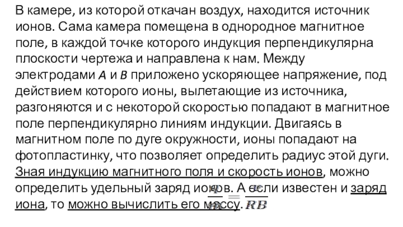 индукция перпендикулярна плоскости чертежа и направлена к нам. Между электродами A и B приложено ускоряющее напряжение, под действием которого ионы, вылетающие из источника, разгоняются и с некоторой скоростью попадают в магнитное поле перпендикулярно линиям индукции. Двигаясь в магнитном поле по дуге окружности, ионы попадают на фотопластинку, что позволяет определить радиус этой дуги. Зная индукцию магнитного поля и скорость ионов, можно определить удельный заряд ионов. А если известен и заряд иона, то можно вычислить его массу.
