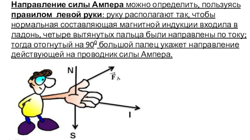 Слайд 10Направление силы Ампера можно определить, пользуясь правилом левой руки: руку располагают