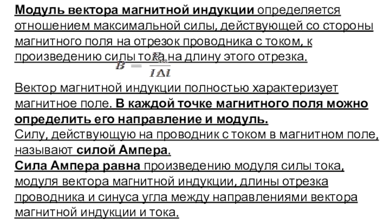 Слайд 32Сила Ампера определяется произведением силы тока в проводнике, модулем магнитной
