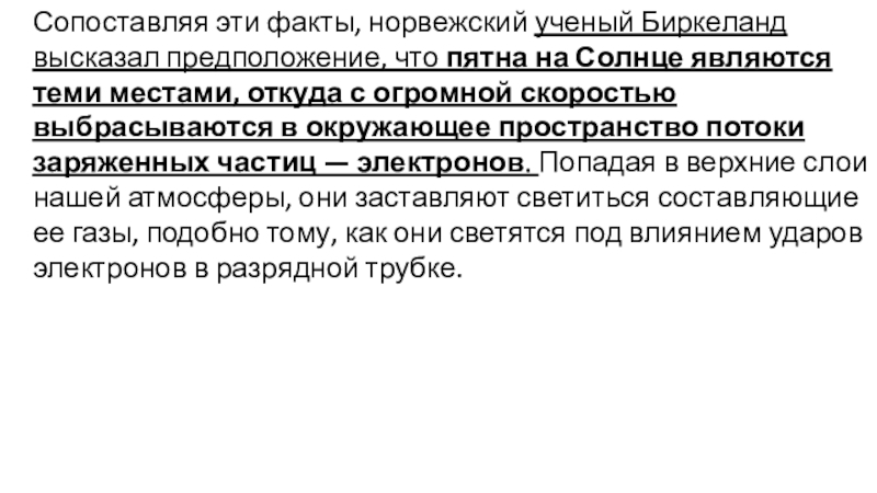 Слайд 48Сопоставляя эти факты, норвежский ученый Биркеланд высказал предположение, что пятна на