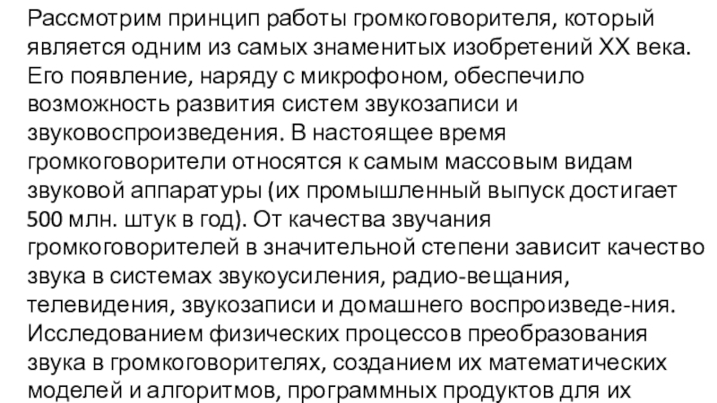 развития систем звукозаписи и звуковоспроизведения. В настоящее время громкоговорители относятся к самым массовым видам звуковой аппаратуры (их промышленный выпуск достигает 500 млн. штук в год). От качества звучания громкоговорителей в значительной степени зависит качество звука в системах звукоусиления, радио-вещания, телевидения, звукозаписи и домашнего воспроизведе-ния. Исследованием физических процессов преобразования звука в громкоговорителях, созданием их математических моделей и алгоритмов, программных продуктов для их расчета и проектирования занимаются десятки университетов и научных центров, а производством — сотни крупнейших фирм.
