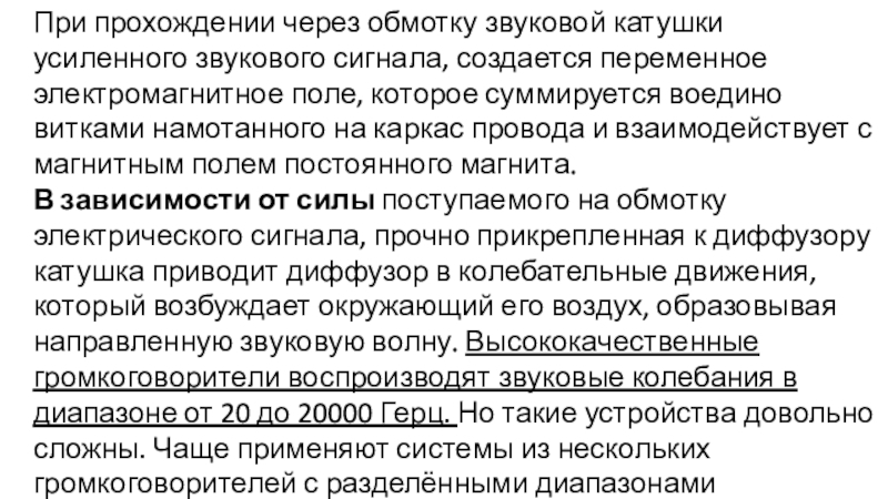 Слайд 23При прохождении через обмотку звуковой катушки усиленного звукового сигнала, создается