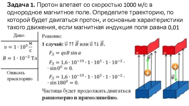 Слайд 35Задача 1. Протон влетает со скоростью 1000 м/с в однородное магнитное