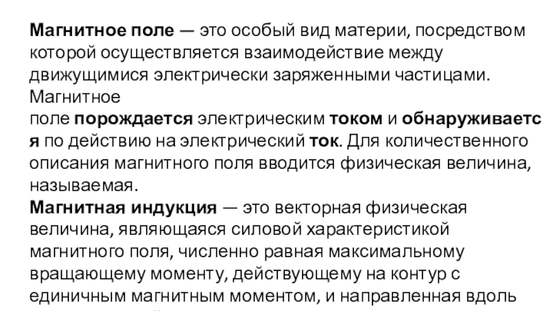 Магнитная индукция — это векторная физическая величина, являющаяся силовой характеристикой магнитного поля, численно равная максимальному вращающему моменту, действующему на контур с единичным магнитным моментом, и направленная вдоль положительной нормали к контуру.