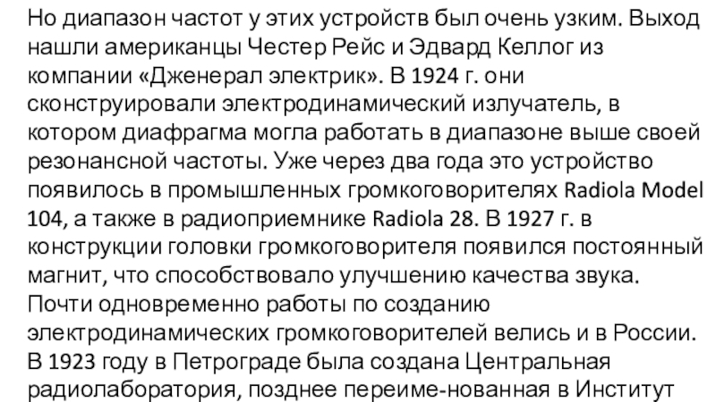 Почти одновременно работы по созданию электродинамических громкоговорителей велись и в России. В 1923 году в Петрограде была создана Центральная радиолаборатория, позднее переиме-нованная в Институт радиовещательного приема и акустики.