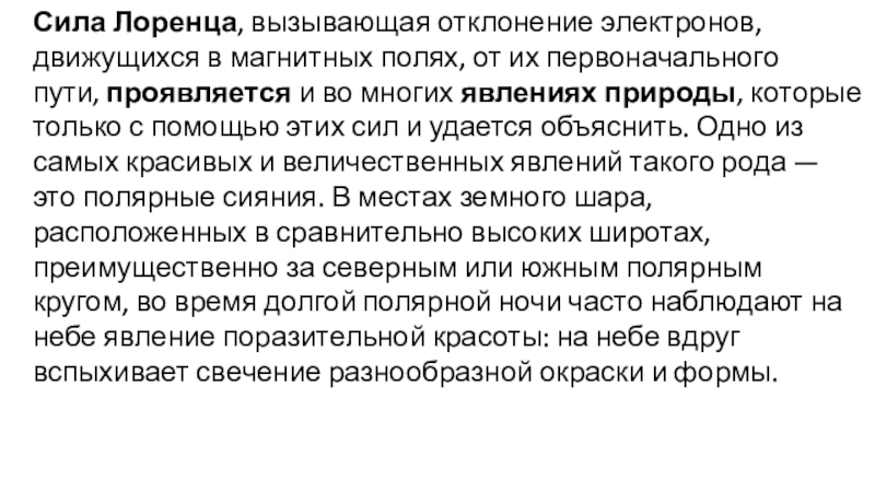 от земных полюсов? Ведь солнечные лучи освещают всю Землю. На этот вопрос ответил другой норвежец, Штермер. Заряженные частицы, испускаемые Солнцем, подходя к Земле, попадают в земное магнитное поле. Здесь на них действует сила Лоренца, отклоняющая их от первоначального прямого пути. Штермер произвел сложные математические вычисления и рассчитал пути этих электронов в магнитном поле Земли. Он показал, что, действительно, заряженные частицы, отклоняемые земным магнитным полем, могут попадать только в приполярные области земного шара.