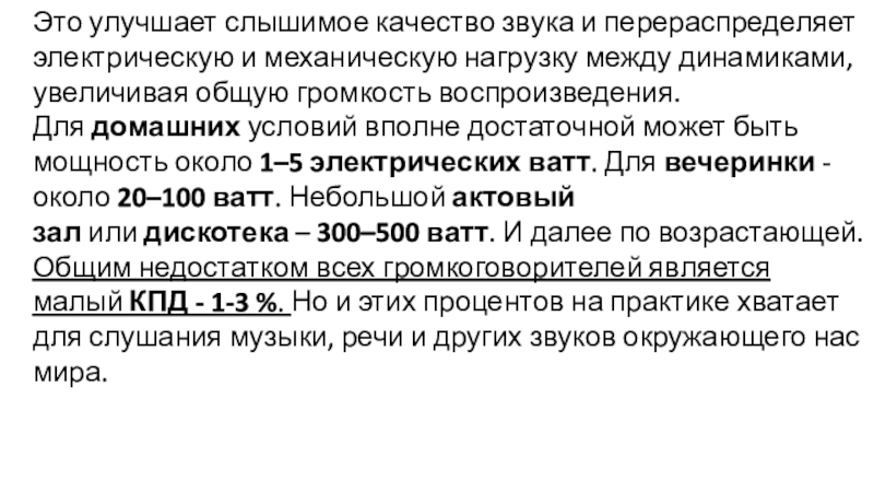 Слайд 24Это улучшает слышимое качество звука и перераспределяет электрическую и механическую