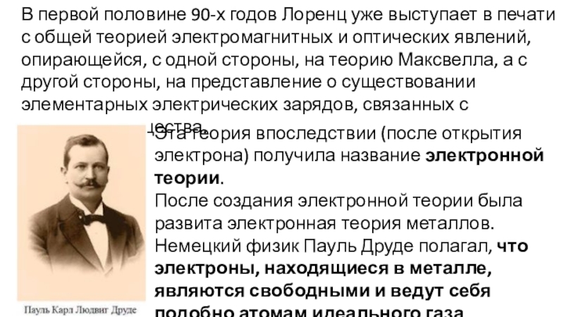 Начиная с 70-х годов XIX века разработкой электронной теории занялся Хендрик Антон Лоренц, объяснивший с ее помощью электромагнитные и оптические явления. Он исходил из того, что теория Максвелла нуждается в дополнении, так как в ней не учитывается структура вещества.