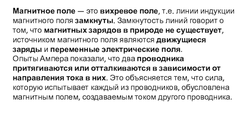 Слайд 3Магнитное поле — это вихревое поле, т.е. линии индукции магнитного поля замкнуты. Замкнутость