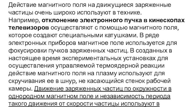 поля, которое создают специальными катушками. В ряде электронных приборов магнитное поле используется для фокусировки пучков заряженных частиц. В созданных в настоящее время экспериментальных установках для осуществления управляемой термоядерной реакции действие магнитного поля на плазму используют для скручивания ее в шнур, не касающийся стенок рабочей камеры. Движение заряженных частиц по окружности в однородном магнитном поле и независимость периода такого движения от скорости частицы используют в циклических ускорителях заряженных частиц — циклотронах.