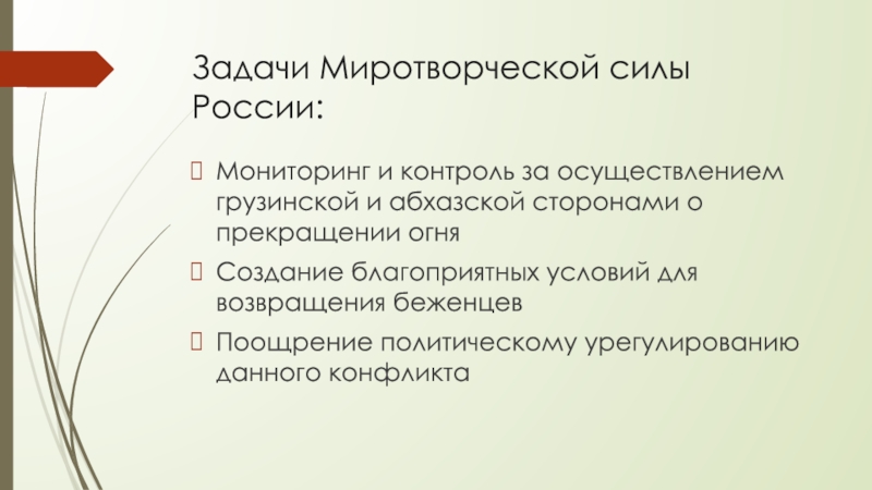 Задачи Миротворческой силы России:Мониторинг и контроль за осуществлением грузинской и абхазской сторонами о прекращении огняСоздание благоприятных условий