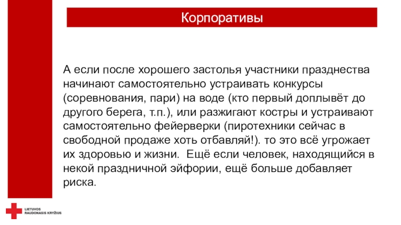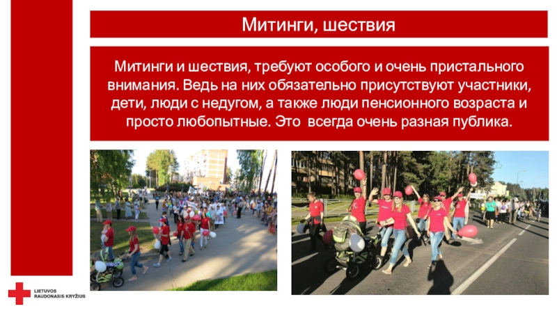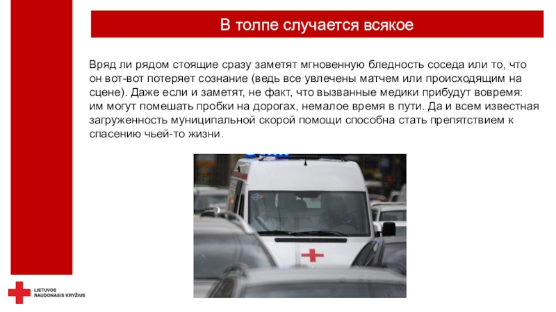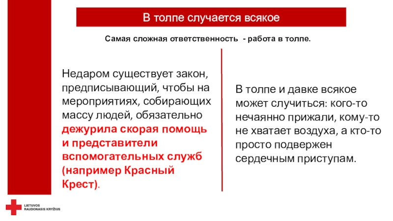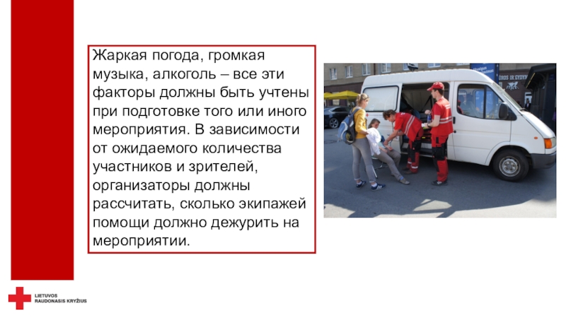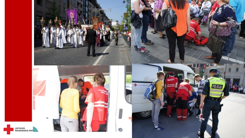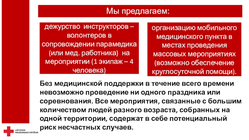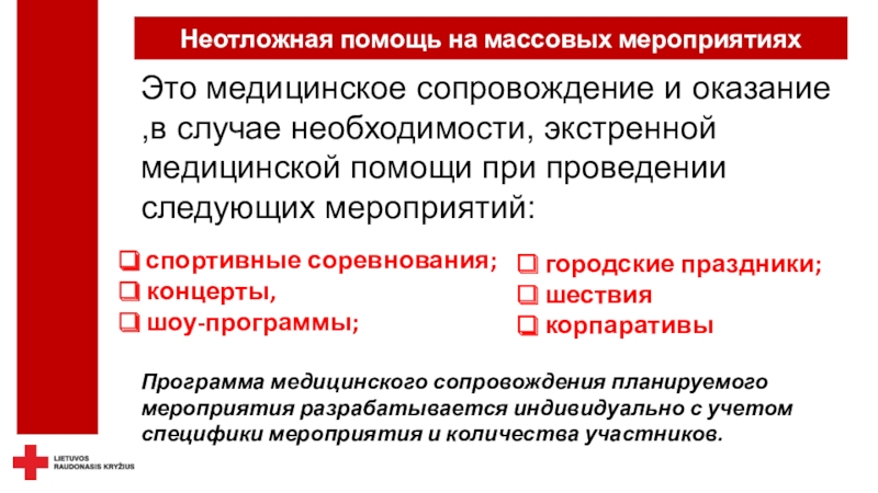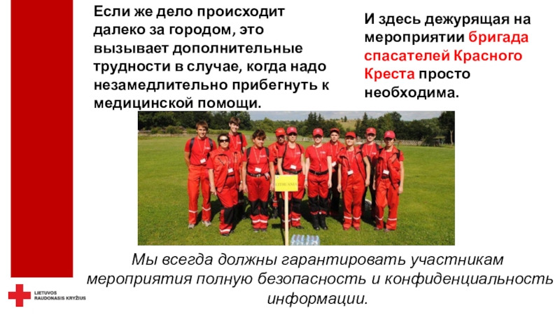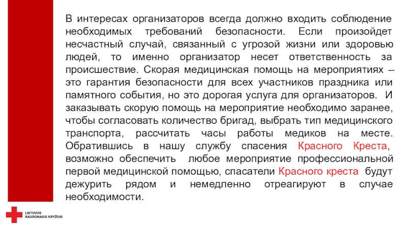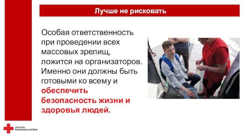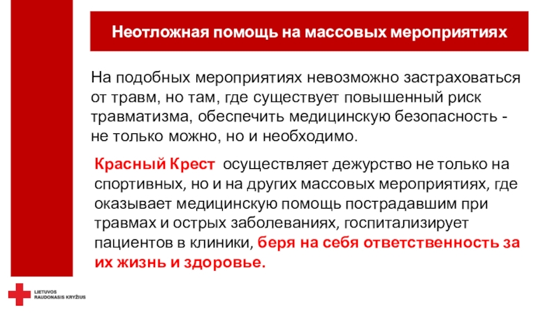безопасность - не только можно, но и необходимо.Красный Крест осуществляет дежурство не только на спортивных, но и на других массовых мероприятиях, где оказывает медицинскую помощь пострадавшим при травмах и острых заболеваниях, госпитализирует пациентов в клиники, беря на себя ответственность за их жизнь и здоровье.