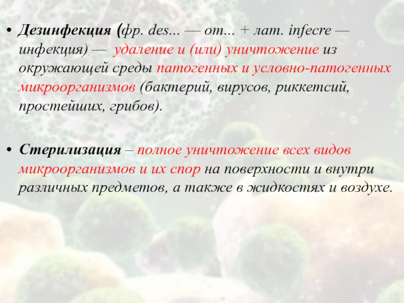 Слайд 2Дезинфекция (фр. des... — от... + лат. infecre — инфекция)