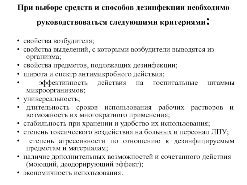 Слайд 13При выборе средств и способов дезинфекции необходимо руководствоваться следующими критериями: