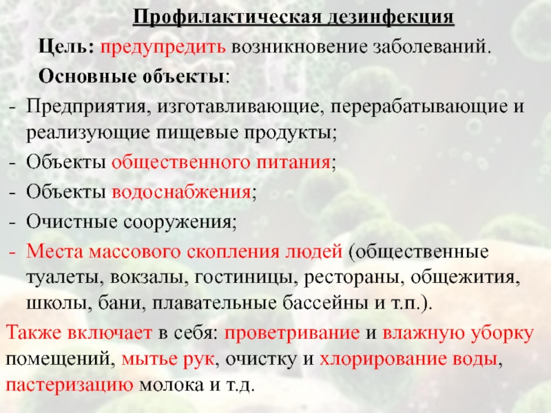 Также включает в себя: проветривание и влажную уборку помещений, мытье рук, очистку и хлорирование воды, пастеризацию молока и т.д.