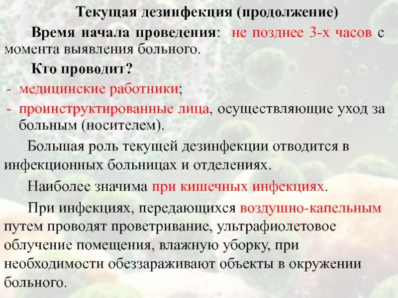 Большая роль текущей дезинфекции отводится в инфекционных больницах и отделениях.