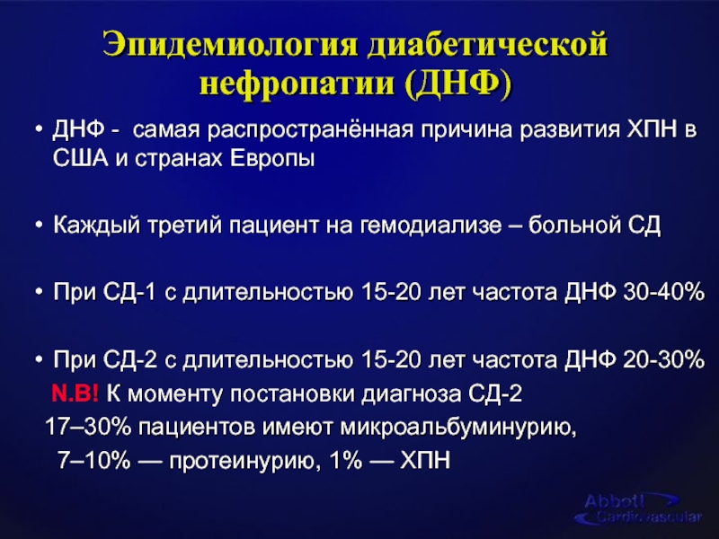 Слайд 3Эпидемиология диабетической нефропатии (ДНФ)