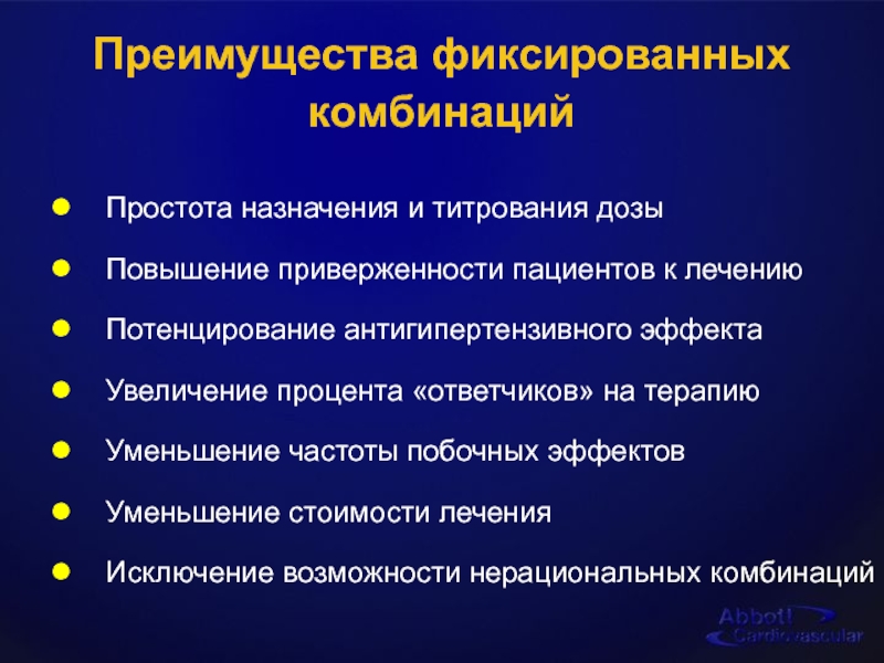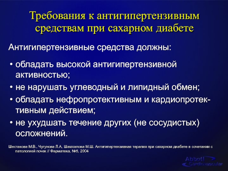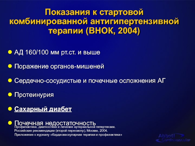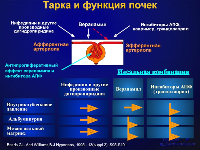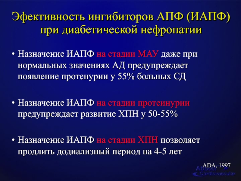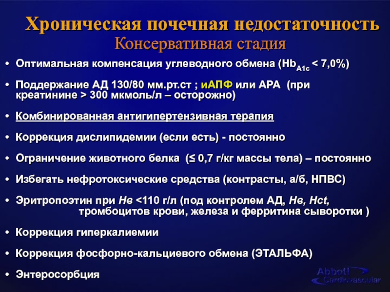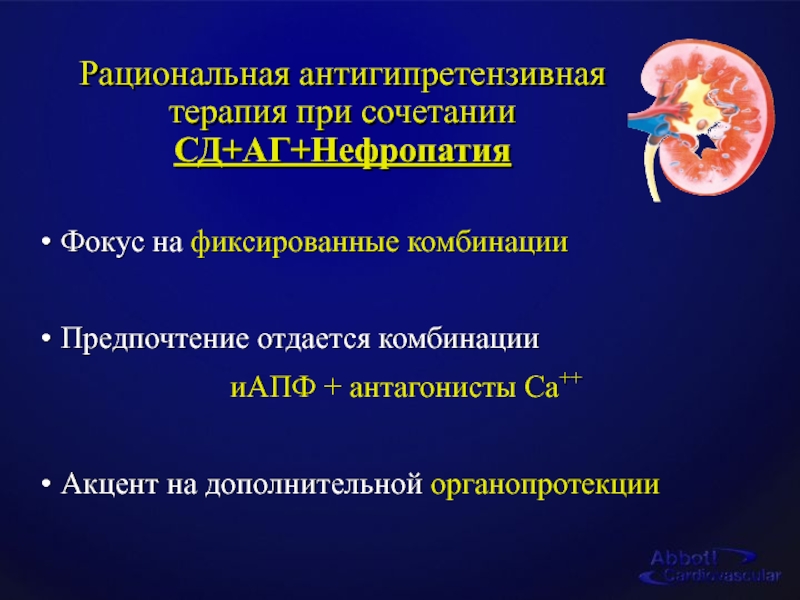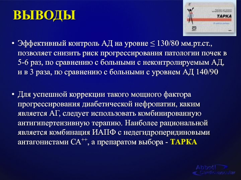Для успешной коррекции такого мощного фактора прогрессирования диабетической нефропатии, каким является АГ, следует использовать комбинированную антигипертензивную терапию. Наиболее рациональной является комбинация ИАПФ с недегидроперидиновыми антагонистами СА++, а препаратом выбора - ТАРКА