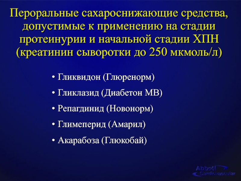 Слайд 12Пероральные сахароснижающие средства, допустимые к применению на стадии протеинурии и