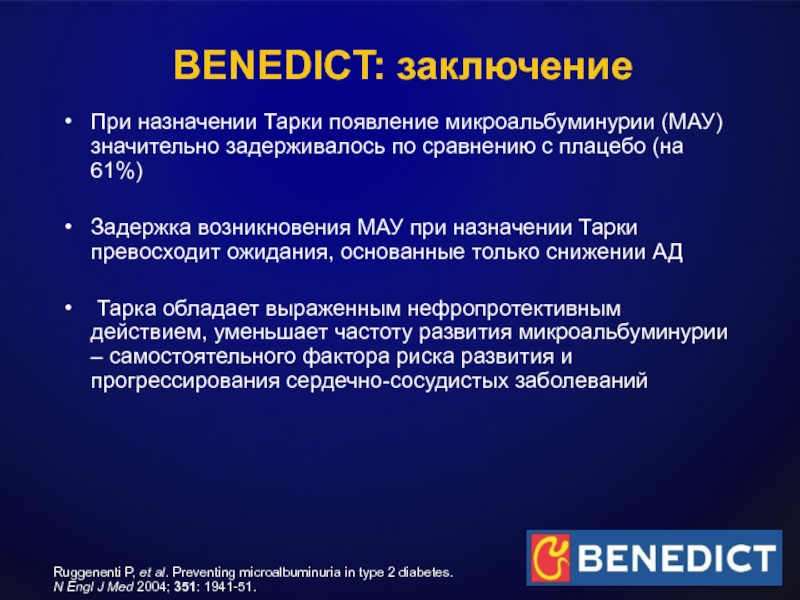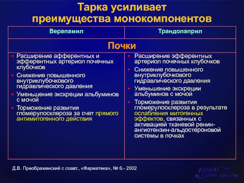 Тарка обладает выраженным нефропротективным действием, уменьшает частоту развития микроальбуминурии – самостоятельного фактора риска развития и прогрессирования сердечно-сосудистых заболеваний