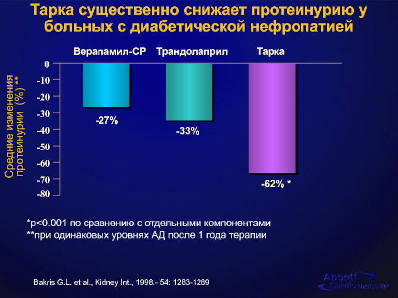 Слайд 33Тарка существенно снижает протеинурию у больных с диабетической нефропатией