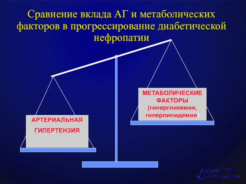 Слайд 15Сравнение вклада АГ и метаболических факторов в прогрессирование диабетической нефропатии