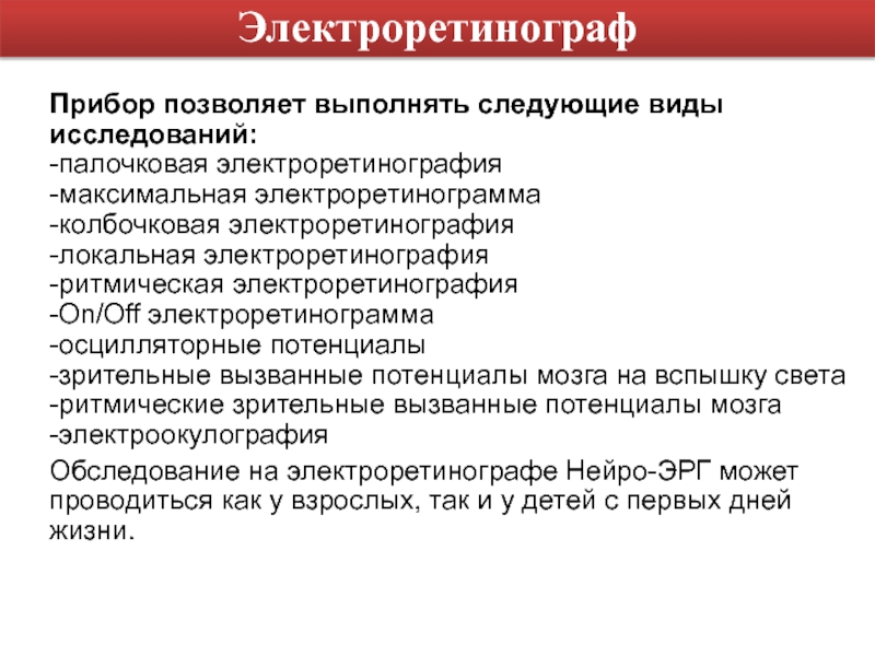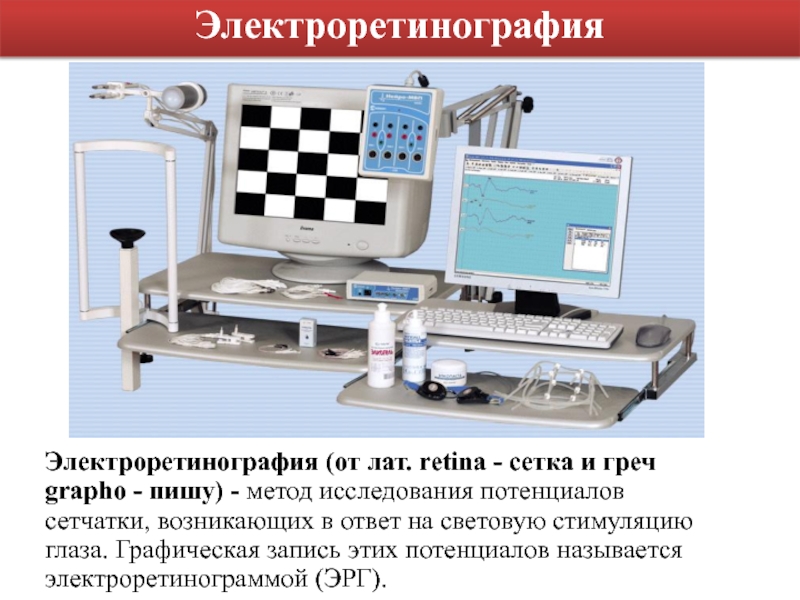 ЭРГ – электроретинография – регистрация биопотенциалов сетчатки глаза, возникающих в результате воздействия на глаз;