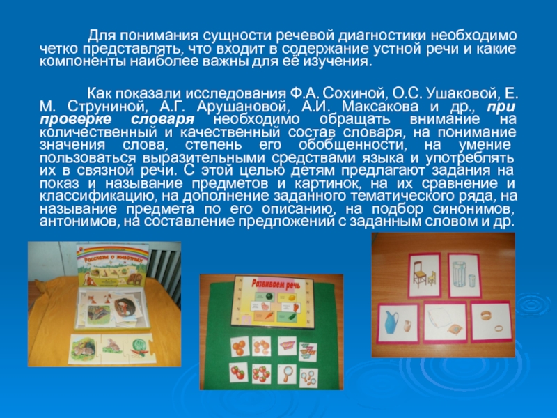 Как показали исследования Ф.А. Сохиной, О.С. Ушаковой, Е.М. Струниной, А.Г. Арушановой, А.И. Максакова и др., при проверке словаря необходимо обращать внимание на количественный и качественный состав словаря, на понимание значения слова, степень его обобщенности, на умение пользоваться выразительными средствами языка и употреблять их в связной речи. С этой целью детям предлагают задания на показ и называние предметов и картинок, на их сравнение и классификацию, на дополнение заданного тематического ряда, на называние предмета по его описанию, на подбор синонимов, антонимов, на составление предложений с заданным словом и др.