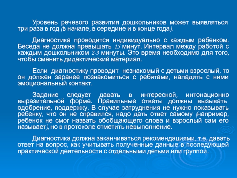 Диагностика проводится индивидуально с каждым ребенком. Беседа не должна превышать 15-20 минут. Интервал между работой с каждым дошкольником 2-3 минуты. Это время необходимо для того, чтобы сменить дидактический материал.