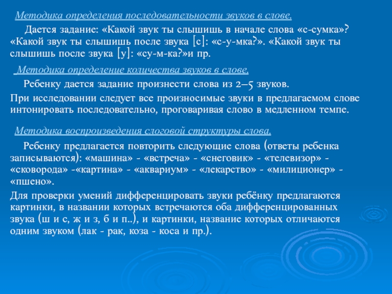 Необходимо при исследовании так подбирать слова, чтобы в них отсутствовали звуки, более сложные по артикуляции, нежели проверяемый звук.