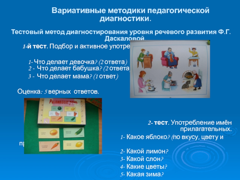 игрушки, одежда, обувь, посуда, мебель, овощи, фрукты, предметы домашнего обихода, домашние животные, и т. д. Необходимо при этом выявить способность детей быстро подбирать точное слово, делать обобщения. Материалом для исследования служат предметные картинки.