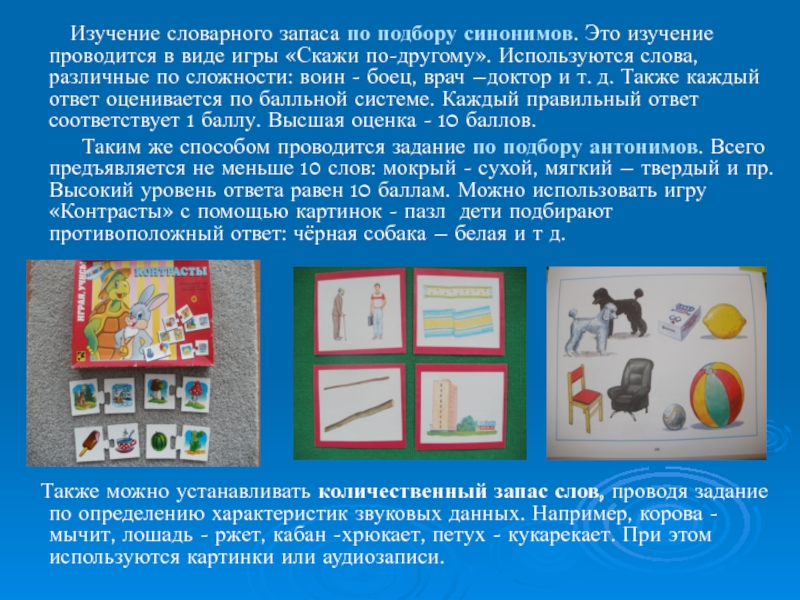 Таким же способом проводится задание по подбору антонимов. Всего предъявляется не меньше 10 слов: мокрый - сухой, мягкий – твердый и пр. Высокий уровень ответа равен 10 баллам. Можно использовать игру «Контрасты» с помощью картинок - пазл дети подбирают противоположный ответ: чёрная собака – белая и т д.