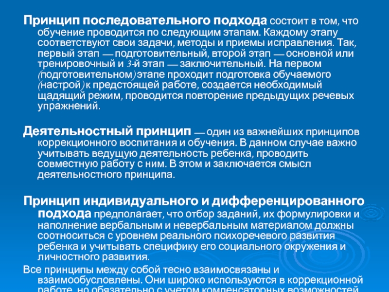 Все принципы между собой тесно взаимосвязаны и взаимообусловлены. Они широко используются в коррекционной работе, но обязательно с учетом компенсаторных возможностей и личностных особенностей детей.