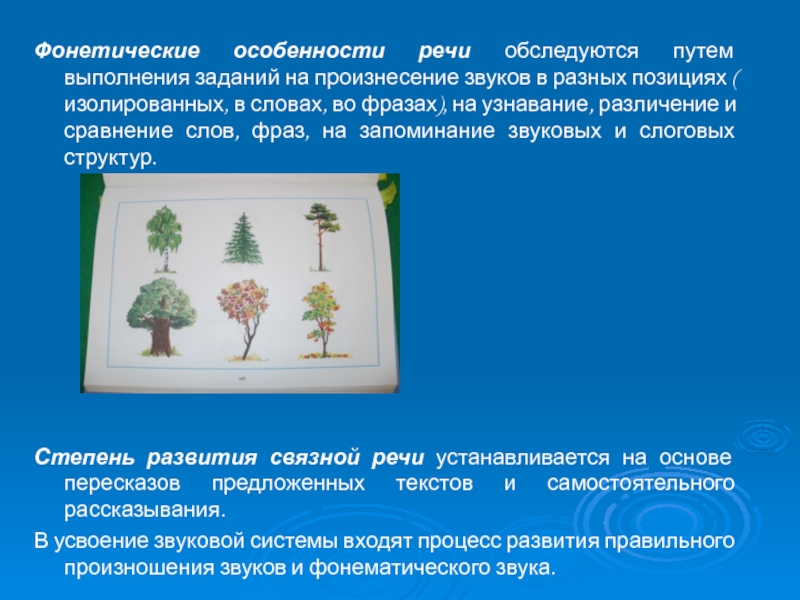 Слайд 23Фонетические особенности речи обследуются путем выполнения заданий на произнесение звуков