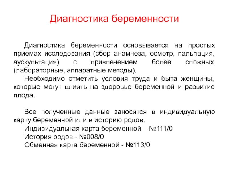 Диагностика беременности основывается на простых приемах исследования (сбор анамнеза,