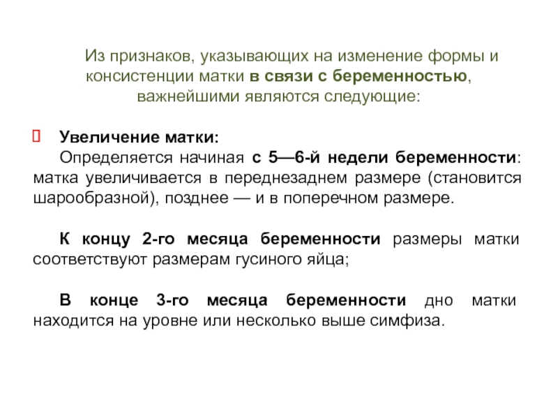 недели беременности: матка увеличивается в переднезаднем размере (становится шарообразной), позднее — и в поперечном размере.
