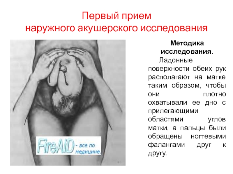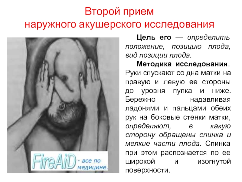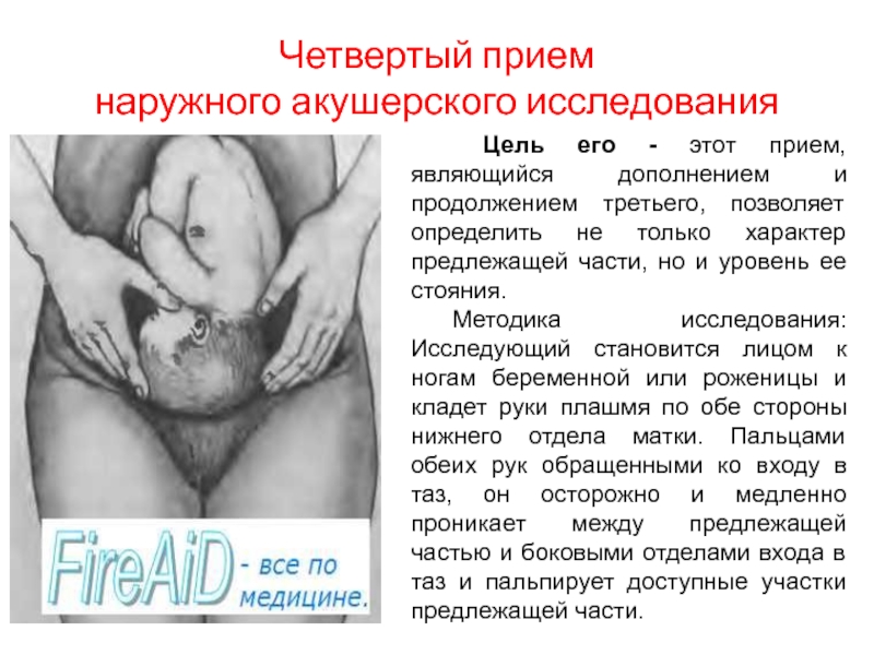 Методика исследования: Исследующий становится лицом к ногам беременной или роженицы и кладет руки плашмя по обе стороны нижнего отдела матки. Пальцами обеих рук обращенными ко входу в таз, он осторожно и медленно проникает между предлежащей частью и боковыми отделами входа в таз и пальпирует доступные участки предлежащей части.