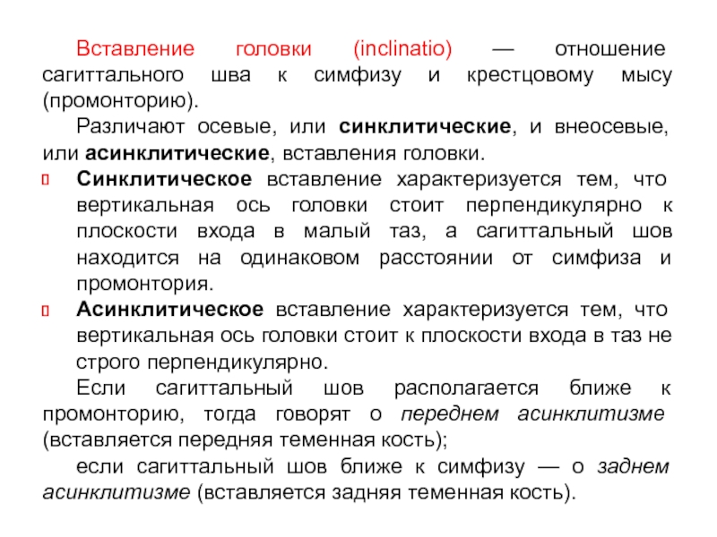 Синклитическое вставление характеризуется тем, что вертикальная ось головки стоит перпендикулярно к плоскости входа в малый таз, а сагиттальный шов находится на одинаковом расстоянии от симфиза и промонтория.