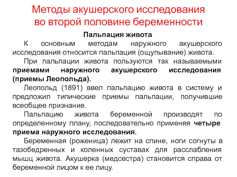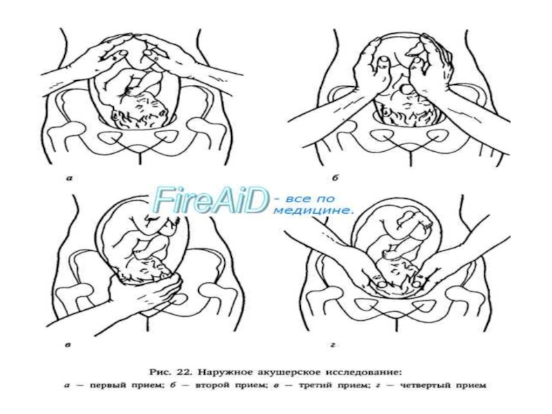 Пальпацию живота беременной производят по определенному плану, последовательно применяя четыре приема наружного исследования.